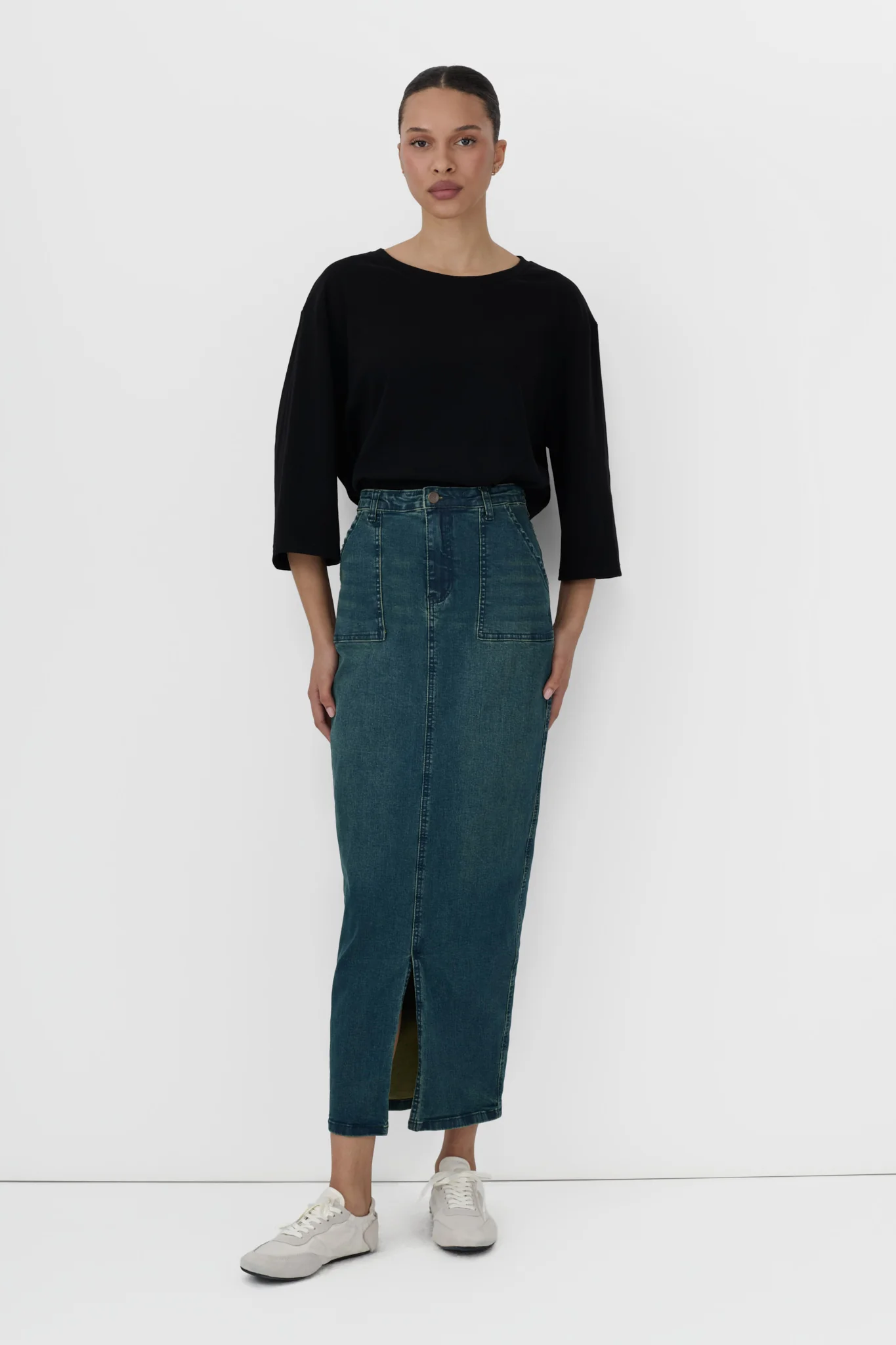 The Denim Front Slit Skirt is a modern modest essential, designed with a clean front slit for ease of movement and a bit of extra stretch for all-day comfort. Available in light blue, faded medium denim, and dark navy, it pairs effortlessly with elevated basics for a breathable, on-trend summer look.