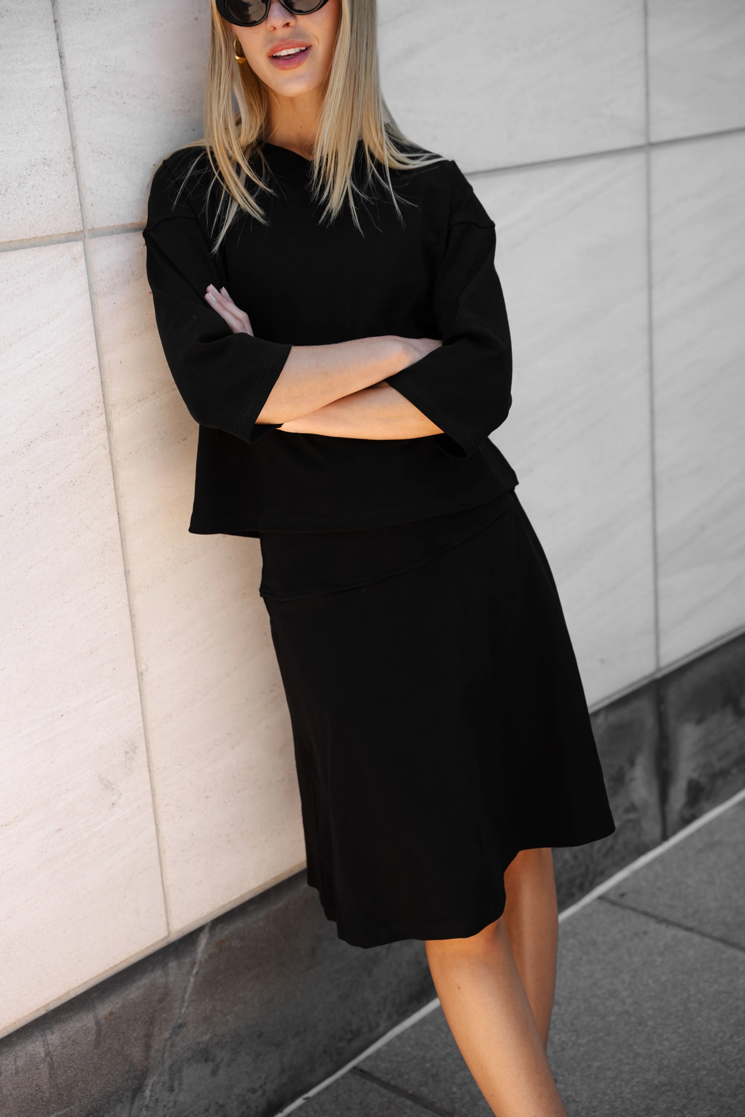 In classic black, this is the skirt you’ll be reaching for on repeat. Made from our soft jersey fabric with the perfect flow and swing, it’s as good for your morning walk as it is for a cozy rainy day look. Dress it up, dress it down—this skirt does it all.