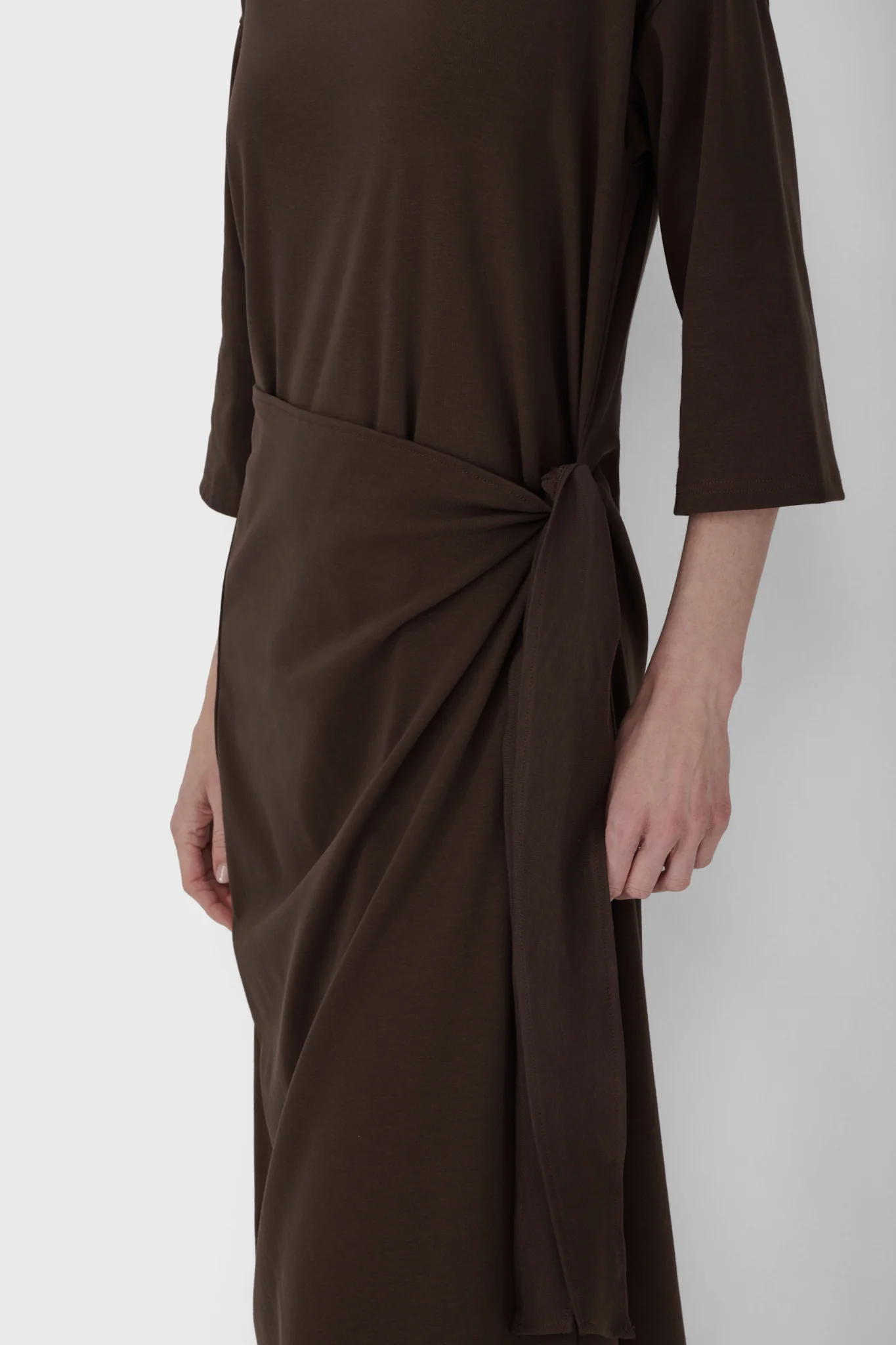 A modest jersey midi dress with a softly draped wrap silhouette and comfortable stretch. Designed to flatter while offering ease, comfort, and understated elegance.