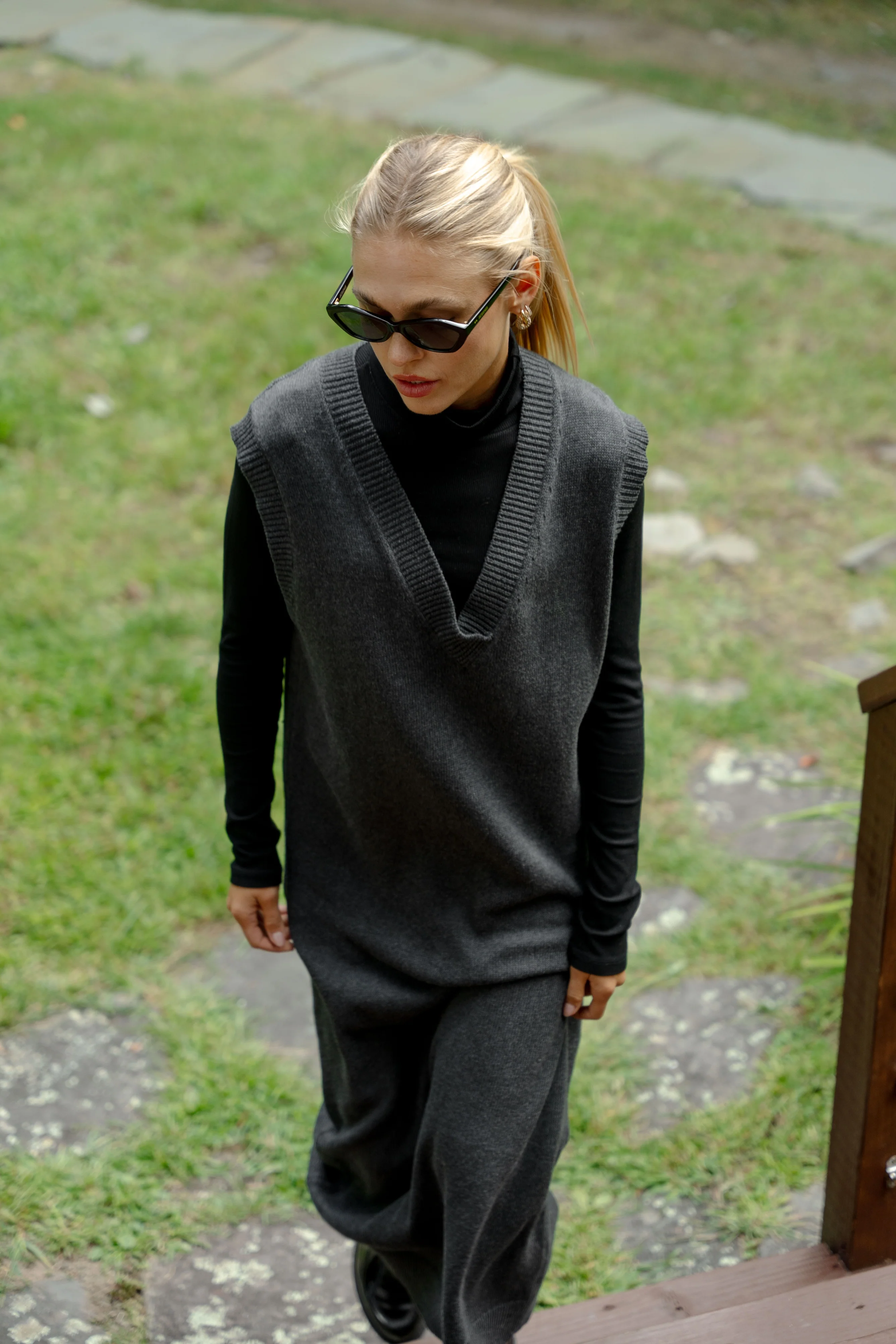 The knit vest dress is the definition of understated chic. Designed in a straight, streamlined silhouette, it’s a sleeveless knit midi that balances comfort with modern polish. Its minimal shape makes it endlessly versatile, whether styled alone or layered for fall.