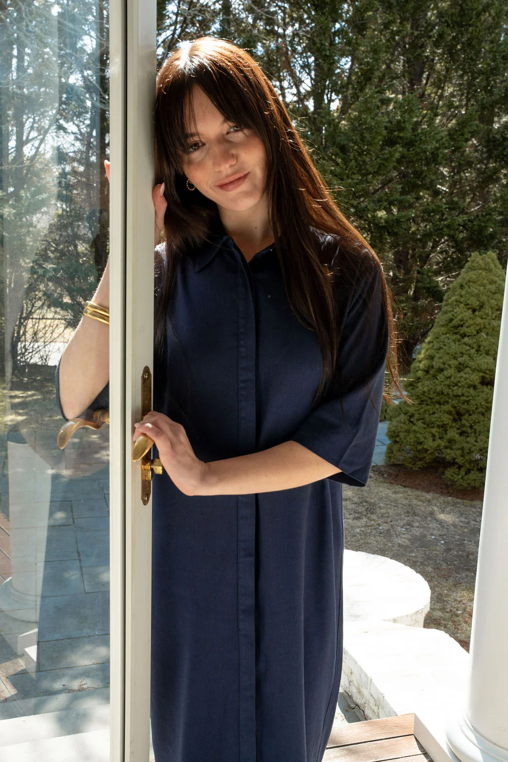 A sleek, tailored silhouette meets breathable linen in this midi shirt dress. Designed to keep you cool and polished all summer long. Available in off-white and navy.