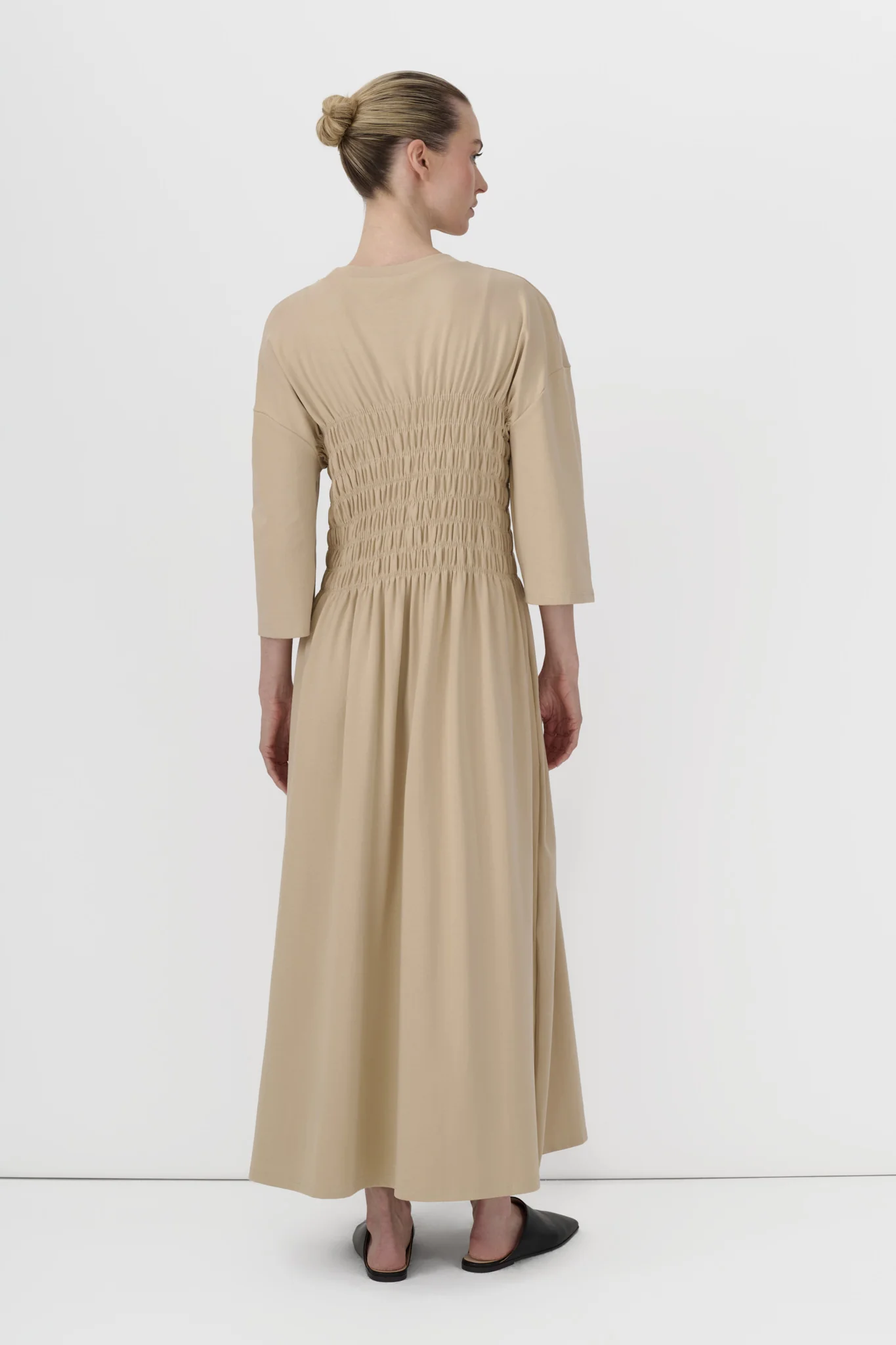 A modest midi dress in soft stretch jersey with subtle smocking for gentle shaping. Comfortable, flattering, and designed for effortless refinement.